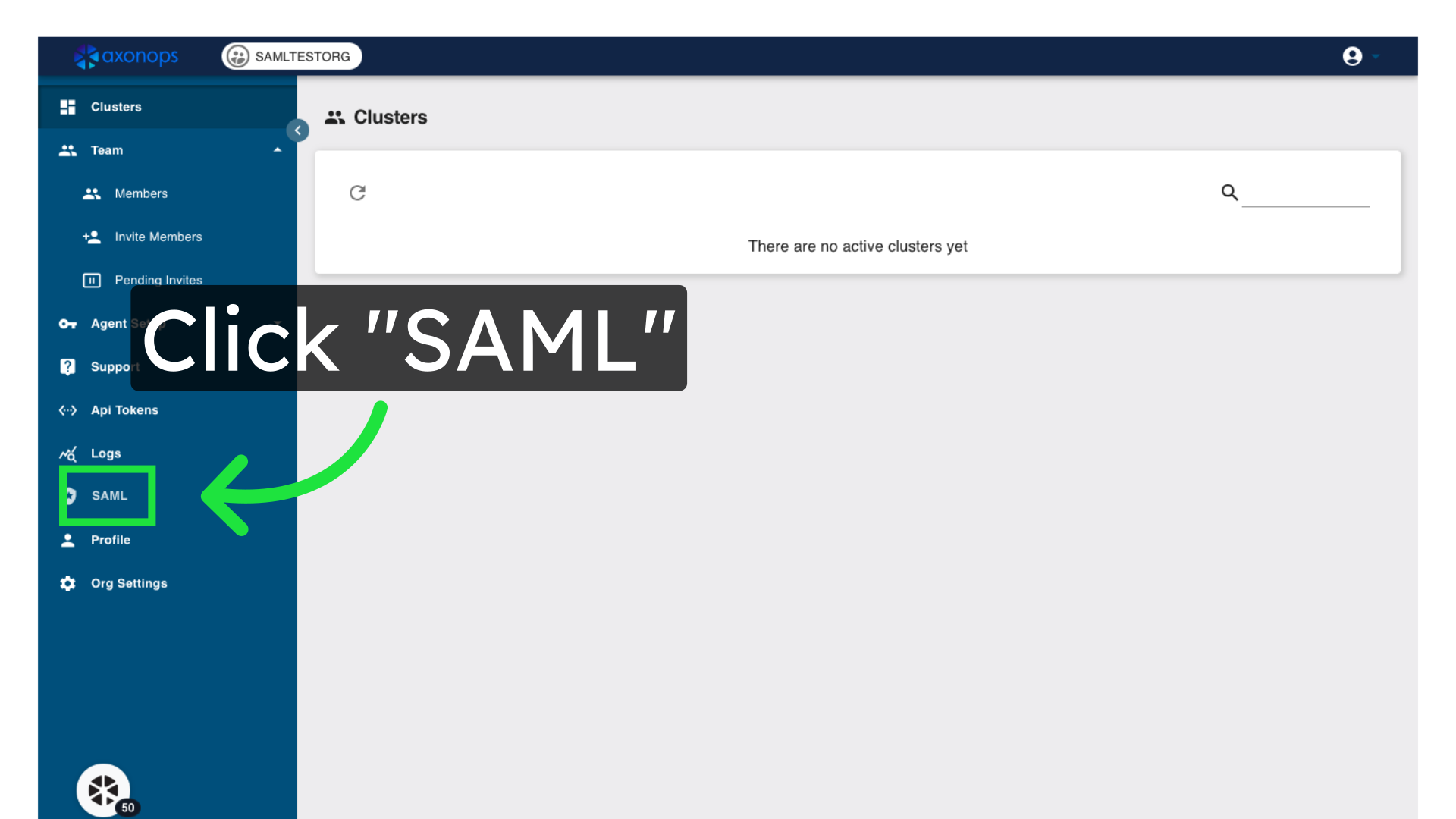 Go to the AxonOps console and login as a user with superadmin rights. Open the SAML page by clicking the SAML link in the sidebar.