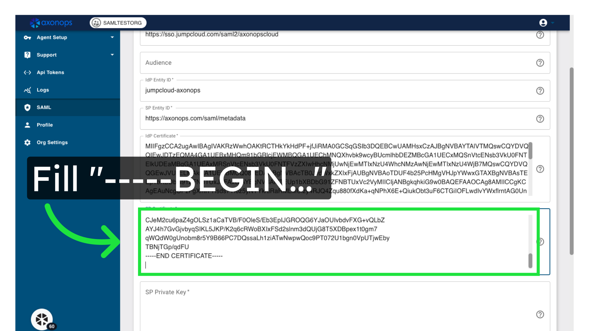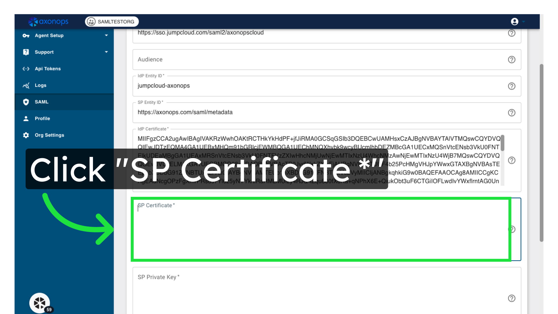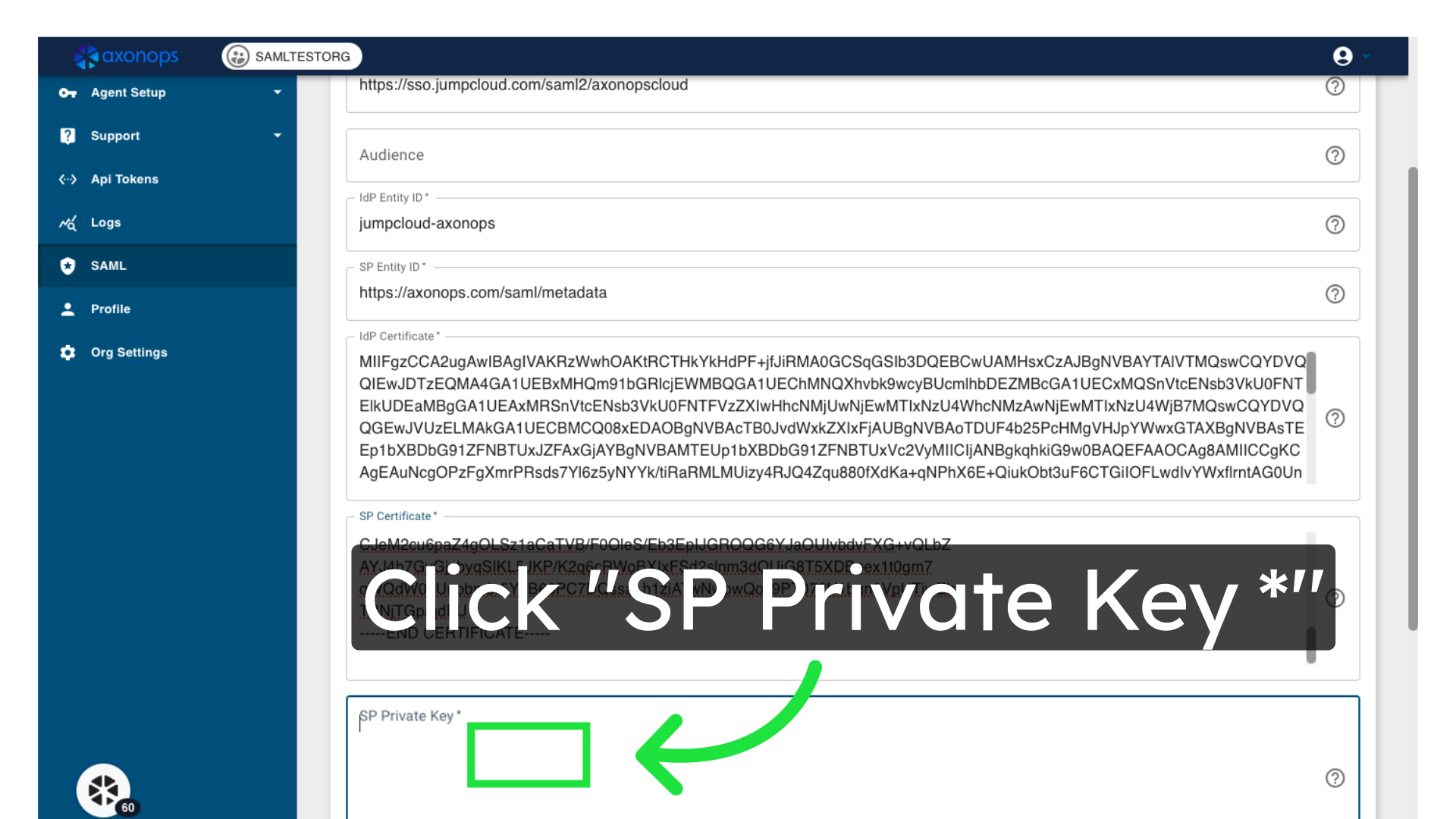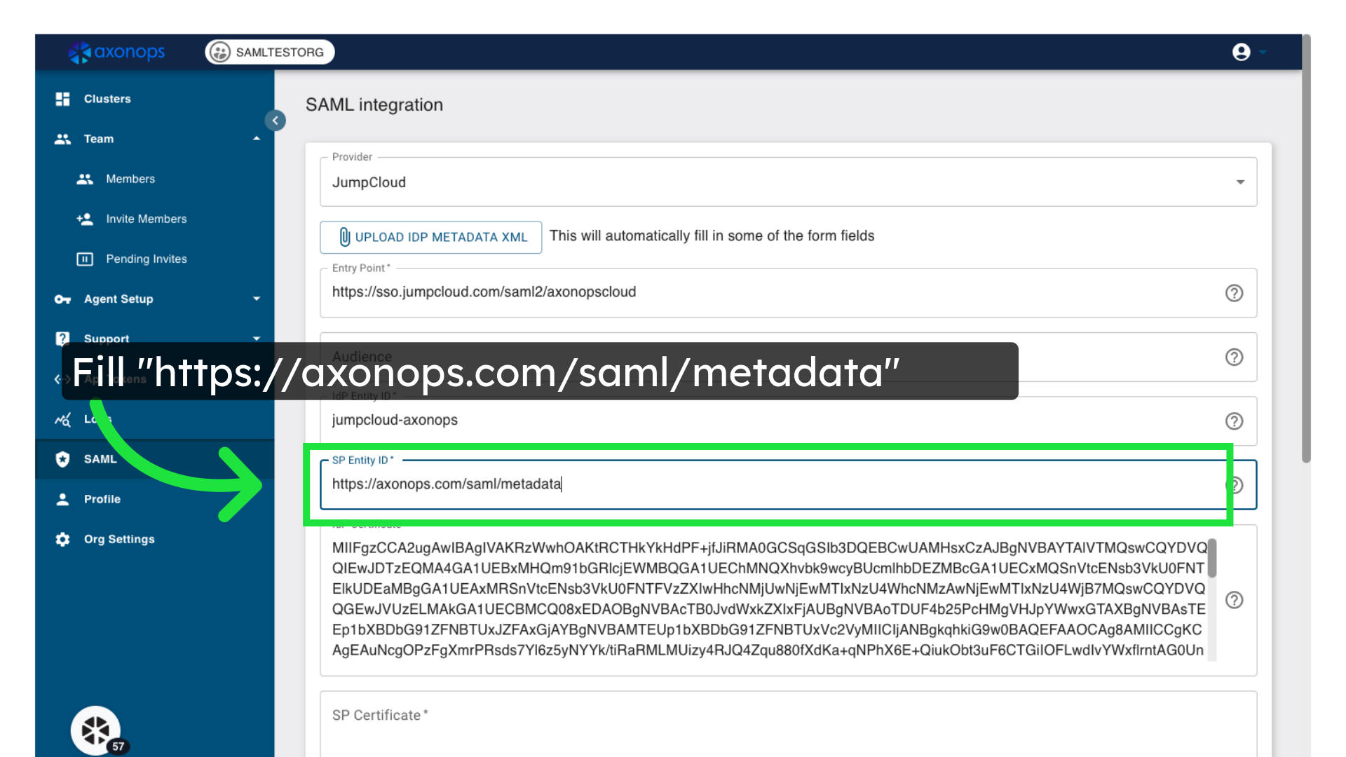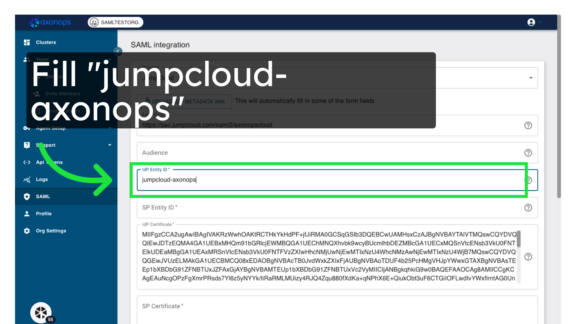 Fill in the text box with jumpcloud-axonops, this must match the IdP Entity ID entered in JumpCloud.