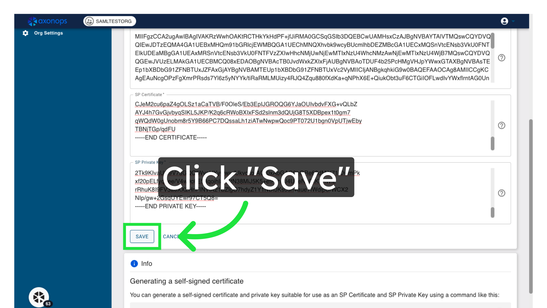 Paste the PEM-format certificate you generated in the prerequisites into the SP Certificate field