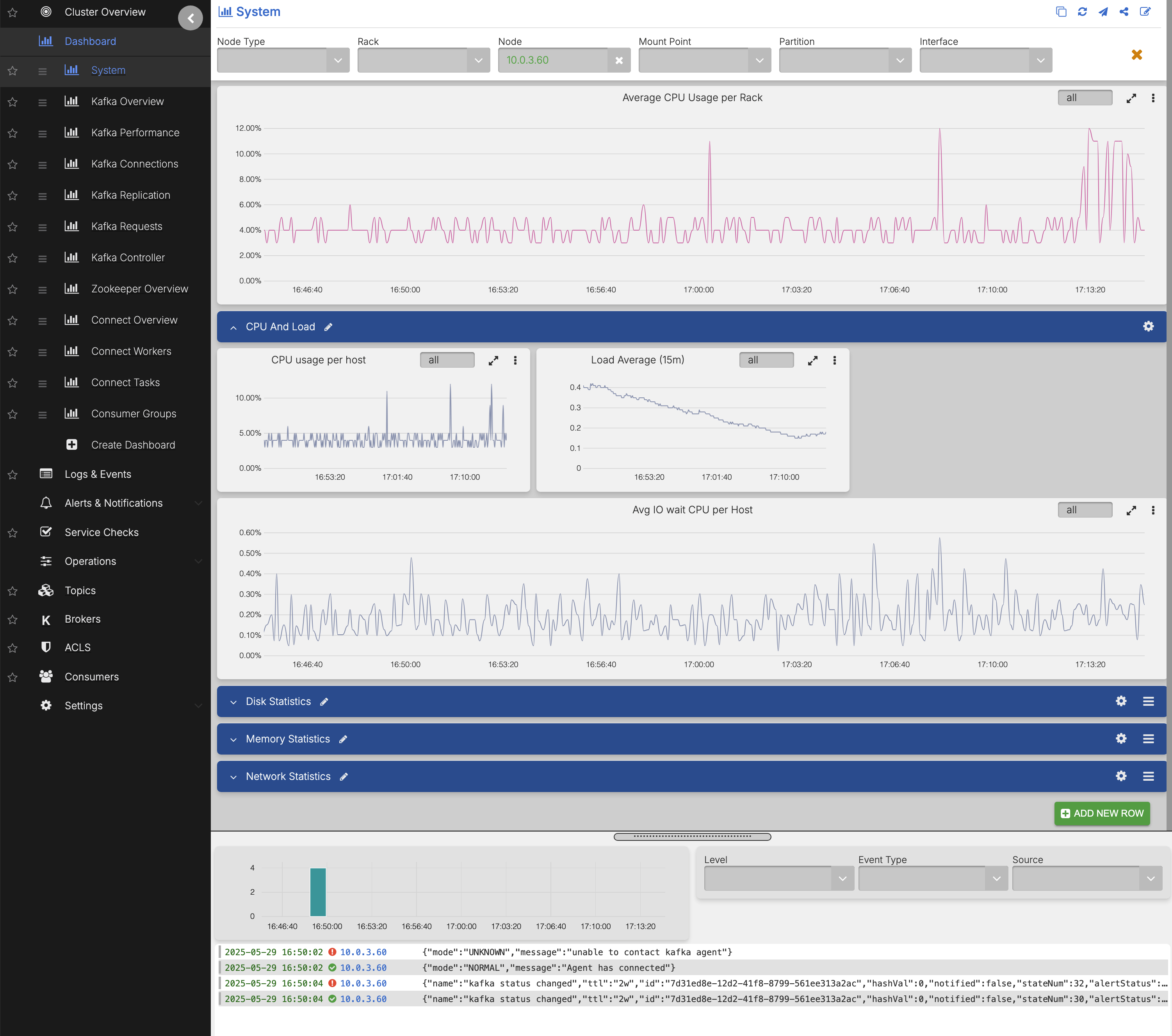 AxonOps dashboards provides a comprehensive set of charts with an embedded view for logs and events.