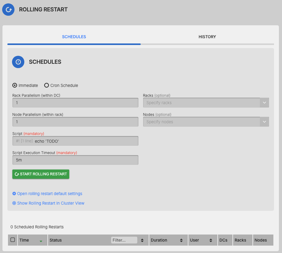 For instance, to restart one entire rack at once across the cluster, you can set a large Node parallelism (greater than the number of nodes the rack has, ie 999).